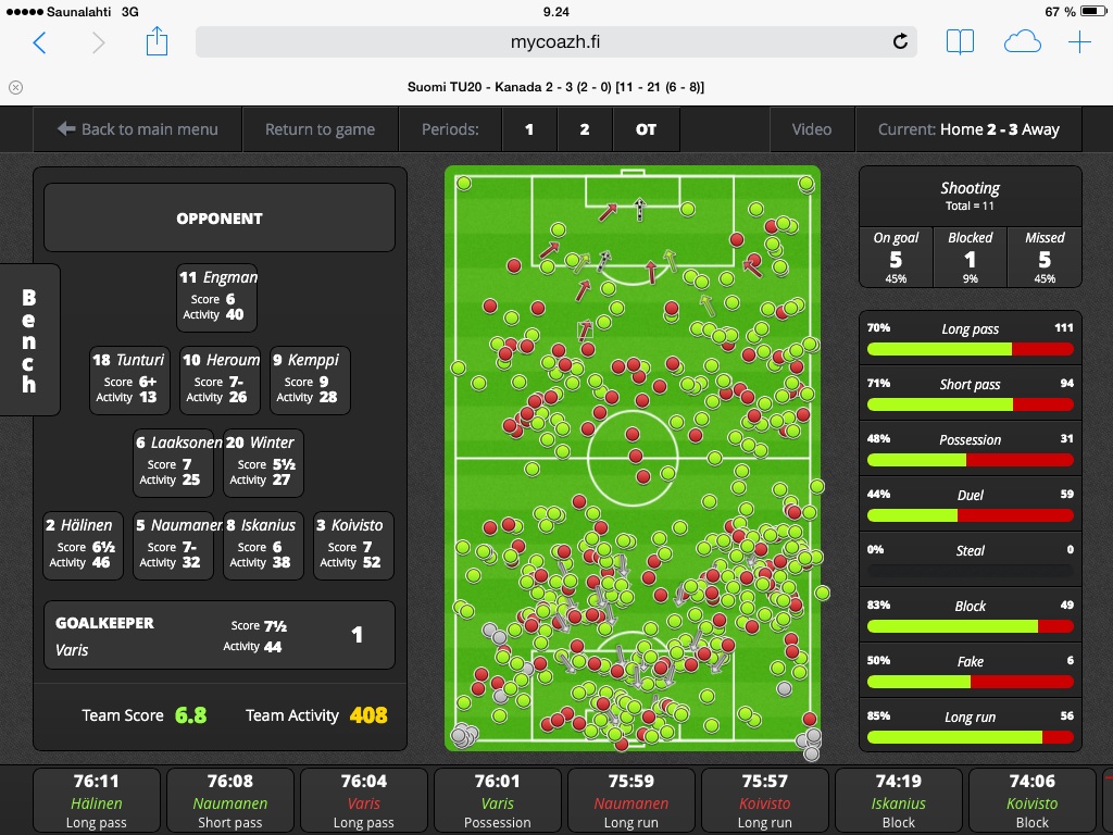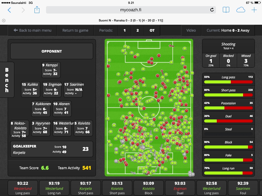 hintaan 2,99 e. Edellisissä MM-kisoissa tämä kaikki siis tehtiin vielä ”kynä ja A4:n” –versiolla. Nyt iPadilla toimivalla Mycoazh PROlla tilastoidaan koko joukkueen tapahtumat ja MyCoazh Footballin avulla voi kuka tahansa tehdä yhden pelaajan suorittamisen scouttaamista rajattomasti. MyCoazh Football syntyi näiden pelaajascouttausraporttien pohjalta ja sitä on niin helppo käyttää, että sen pystyy ottamaan heti käyttöön pelkästään lukemalla Help-ohjeet. Jos haaveilet huippufutisurasta ja tiedät jo tulevan pelipaikkasi MyCoazh Footballin avulla voit verrata oman pelipaikkasi huipun suorittamista omaan suorittamiseesi. Totta kai pelin tempo ja kovuus ovat eri luokkaa, mutta pelien sisällä otteluiden voittamisen logiikka ja itse asiassa tapahtumamäärätkin ovat hämmästyttävän samoja, oli sitten kyse MM-kisapelistä, Champions liigan finaalista, Veikkausliigan, Naisten liigan tai B-tyttöjen SM-sarjan pelistä. Tämä oli yksi avainlöydöksistä 2011 MM-kisojen jälkeen. Miksi näin, siksi että useimmiten myös vastustaja on samantasoinen! Erot syntyvät erilaisista taktiikoista ja pelaajien osaamisesta, jossa on isoja eroja.