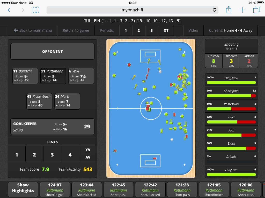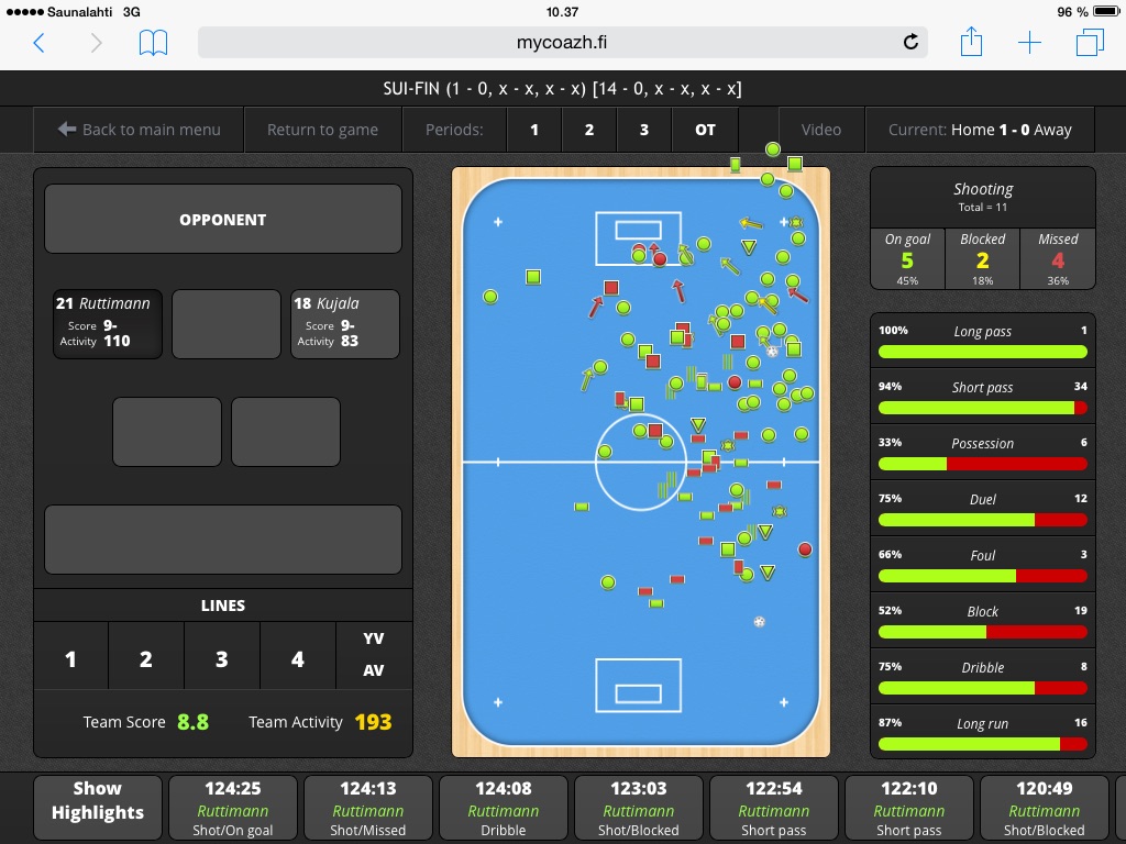 You can use MyCoazh for scouting the opponent, for real-time game analyzing or later for feedback purposes either giving feedback to whole team, lines or individual players. Especially when you can afterwards link a Youtube-video to MyCoazh, then you get all the videoclips of the Events/Actions by just pressing the button! At the moment MyCoazh PRO/Video is still held manually with iPad, but we are now working together with company called AiScreen (www.aiscreen.co) they have tracking knowledge and our common vision is to combine our game analyzing and their tracking knowledge in some period of time.