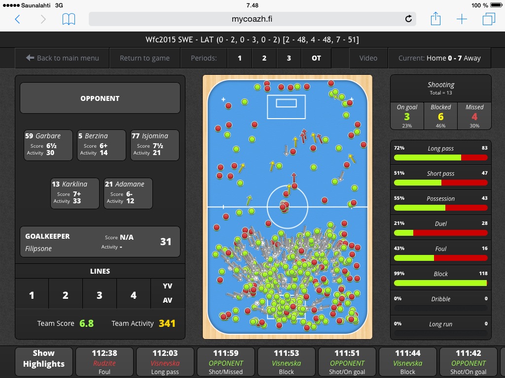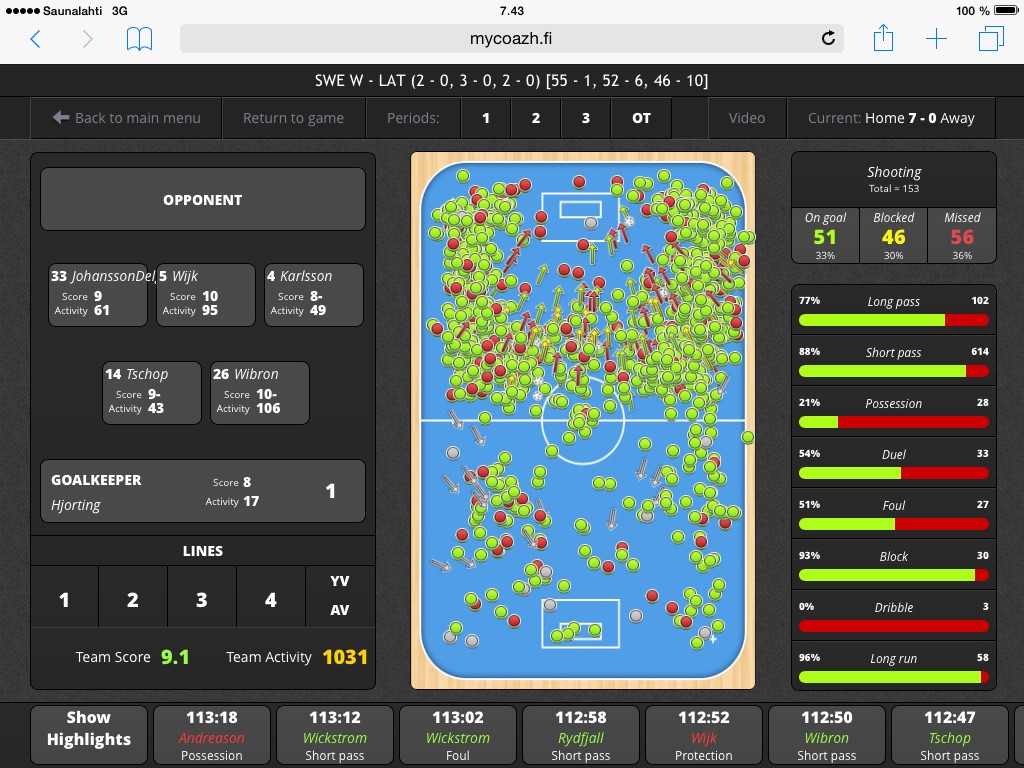 Here you can see how different one game can be: it depends on which team’s point of view you are watching it! Above is game analysis of the SWE – LAT 7-0 game from Sweden’s point of view. MyCoazh PRO/Video game analysis is always done by one team’s angle. From opponent’s events you mark only shots. Usually in one floorball game there are about 600 – 660 events/actions. On this one Sweden had 1 031!