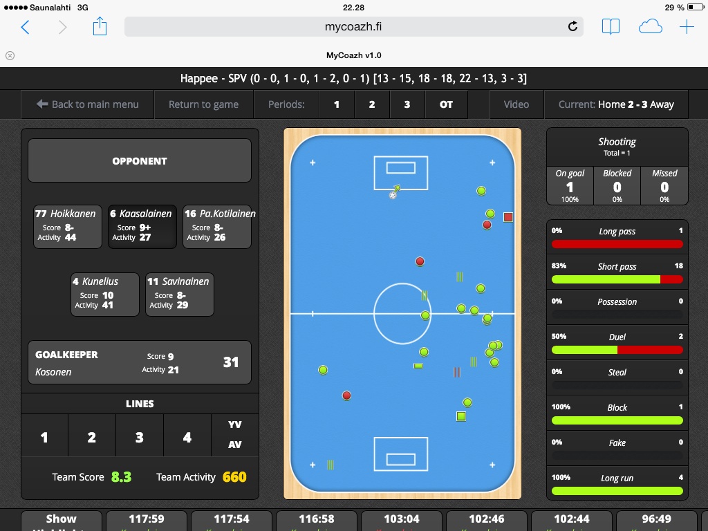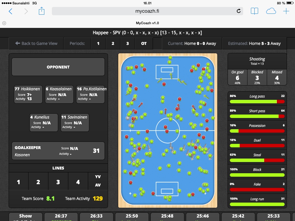 Mitä nämä muut täplät tuossa kenttäkuvassa ovat? Ne ovat tapahtumia, joissa Happeen pelaaja ja pallo kohtasivat. Periaatteessa MyCoazhilla merkitään kaikki “peliä eteenpäin vievät tapahtumat, kun pelaaja ja pallo kohtaavat”. Syöttöjä, kaksinkamppailuja, vedon tai syöttösuunnan peittoja tai pallollisia kuljetuksia. Yhdessä pelissä tapahtumia tulee keskimäärin 600 kappaletta. Kuten kuvassa oikealla olevista tilastoista voi nähdä, Happeen syöttöprosentit 1. erässä olivat hyvät mutta kaksinkamppailupelaamisessa homma ei toiminut niin hyvin kuin olisi ollut mahdollista (possession = pallon haltuunotto ja duel = kaksinkamppailu). Tuloksia voidaan esittää näin koko joukkueen tilastoina, ketjuttain tai yksittäisen pelaajan statseina. MyCoazh laskee jokaiselle pelaajalle arvosanaa Score sekä Activity:a, joka on pallokosketukset. Score vaatii pelaajalta 10 pallokosketusta. Tämän vuoksi kaikilla pelaajilla ei vielä ensimmäisen erän jälkeen ole Score:a.