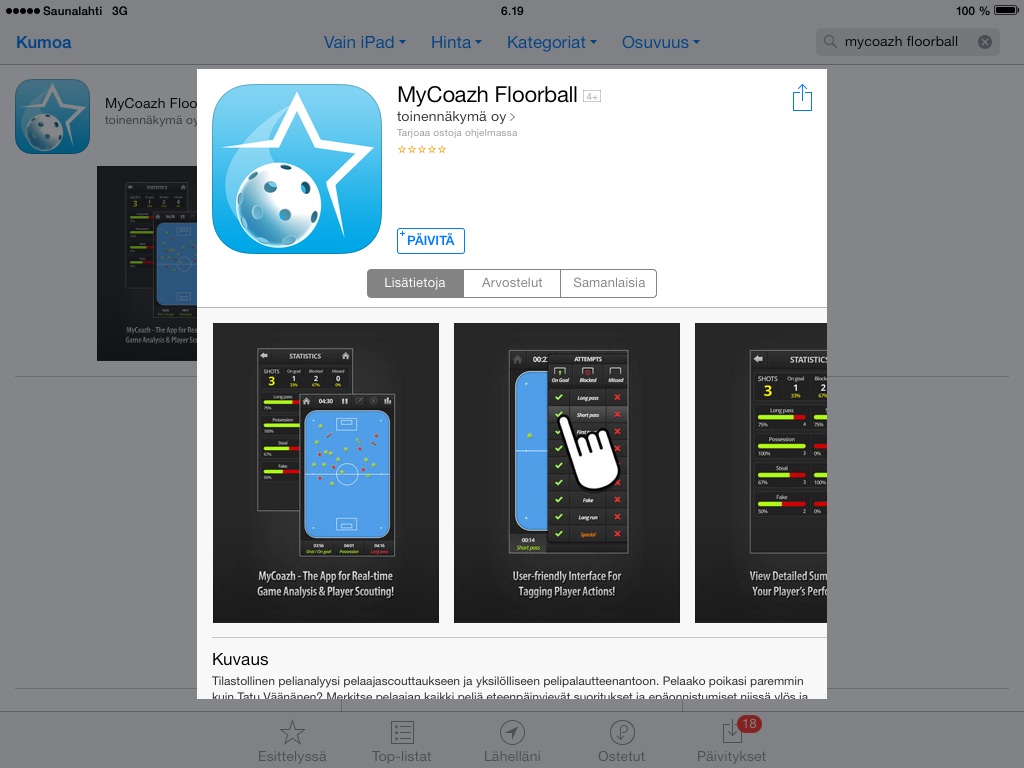 MyCoazh Floorball -mobiilisovelluksen pystyt ottamaan käyttöön välittömästi pelkkien info-ohjeiden avulla. Kerää suosikkipelaajasi pallolliset tapahtumat (syötöt, laukaukset, kaksinkamppailut, kuljetukset jne.) ja lähetä Statistics- tai kenttäkuva pelaaja- ja ottelutiedon kera Twitterillä @MyCoazh ja saat paluupostina pelaajasi MyCoazh Score arvosanan sekä palautteen onnistumisesta.