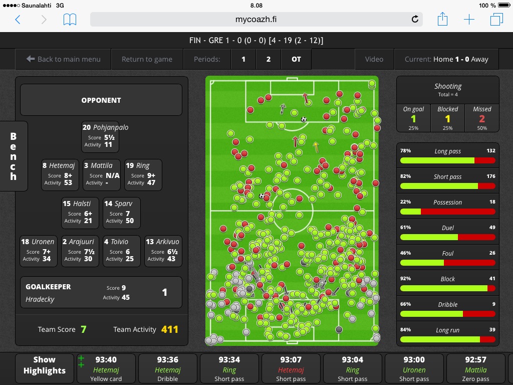 Possession on terminä hieman harhaanjohtava MyCoazhissa se tarkoittaa pallon haltuunottoa/irtopallon ”löytämistä”/suojausta, ei siis joukkueen pallonhallintaa. Tämä on kirjattavissa tapahtumissa futispelissä melkein aina punaisena (enemmän epäonnistuneita kuin onnistuneita suorituksia). Molempien joukkueiden voiton takuuna oli vahva oman maalin edustan puolustus, mikä näkyy Dueleissa eli kaksinkamppailuissa. Kaikki arvot yli 50:n ovat hyviä, mutta yli 60:n on jo kaksinkamppailujen dominointia. Molemmat joukkueet rikkoivat vähän vastustajaansa enemmän (Foul = vihelletyt rikkeet). Blockin alle menevät sekä laukausten peitot että syöttöjen katkot, ja siinä ottelun voittoa ennustaa juuri yli 90 prosentin onnistuminen. Molemmat joukkueet uskalsivat myös haastaa pallollisina vastustajaa. Pikkuhuuhkajat siinä myös onnistuivat huippuhyvin. Long runin alla ovat sekä pallolliset kuljetukset että ”juoksukilpailut” irtopalloihin. Näissä molemmat joukkueet olivat varsinkin ensimmäisillä puoliajoilla vaikeuksissa. Huuhkajilla tapahtui juuri tässä toisella puoliajalla suurin muutos, mikä selittää, miksi toinen puoliaika oli vähän parempi kuin ensimmäinen.