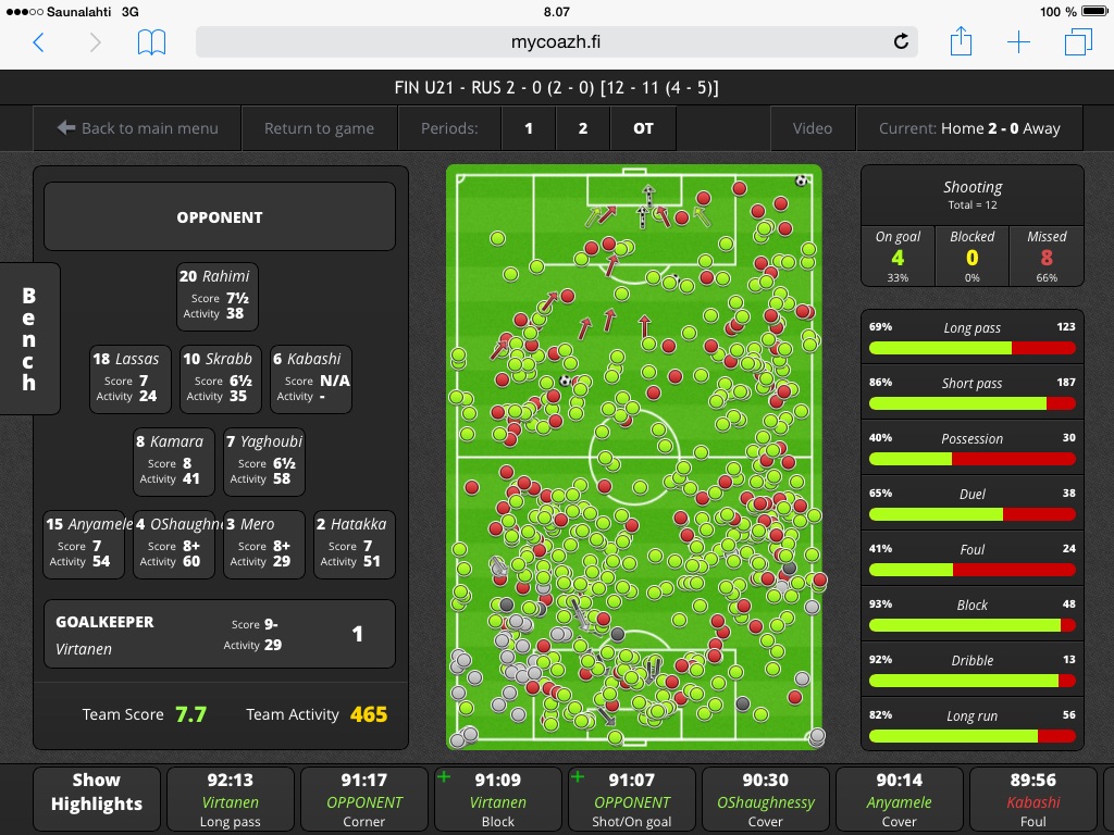 Entä sitten pelaajittain arvioituna, ketkä onnistuivat ja ketkä eivät? Tämä osio jakaa valmentajia vahvasti, koska osa valmentajista on sitä mieltä, ettei joukkuelajissa yksittäisen pelaajan osuutta saa eikä voi arvioida. Kyllä se on aina joukkue, joka voittaa tai häviää, mutta kyllä myös jokaisen pelaajan suorittamista voi ja pitääkin arvioida. Valmentajat itse arvioivat suhteessa taktiikkaan ja pelaajan rooliin, MyCoazh –tilastollinen pelianalyysi arvioi suhteessa mitä tarvitaan yleensä otteluiden voittamiseen. Pikkuhuuhkajien parhaita olivat mv. Virtanen, topparit O’Shaughnessy ja Mero, Kamara ja kentältä pois vaihdettu Hradecky. 2-0 –tilanteessa Hradeckyn vaihto oli perusteltu, mutta muuten olisi aiheuttanut kysymyksiä. Hradecky oli todella vahva ilmapalloissa ja sai vielä ne useimmiten jatkettua omillekin. Moni olisi varmasti näppituntumalta nostanut kapteeni Yaghoubin onnistujiin, mutta vaikka hän tälle joukkueelle henkisesti onkin ”kaikki kaikessa” ja hänen riistostaan lähti avausmaali, hän ei tässä pelissä erityisesti onnistunut. Hän joutui rikkomaan/rikkoi tässä pelissä liikaa, aiheutti omissa yhden maalitilanteen ja oli omassa vahvuudessaan (pitkät murtavat syötöt) tänään jopa heikko. Hänen johtajaominaisuuksiaan ei kuitenkaan pidä aliarvioida ja kyllähän hän myös kovuudellaan, jotka kirjataan rikkeinä (Foul) lähetti venäläisille viestin. Olennaista on ymmärtää, että Pikkuhuuhkajat voittivat oman pelinsä juuri hyvän joukkuepelaamisen ansiosta – joukkueena!