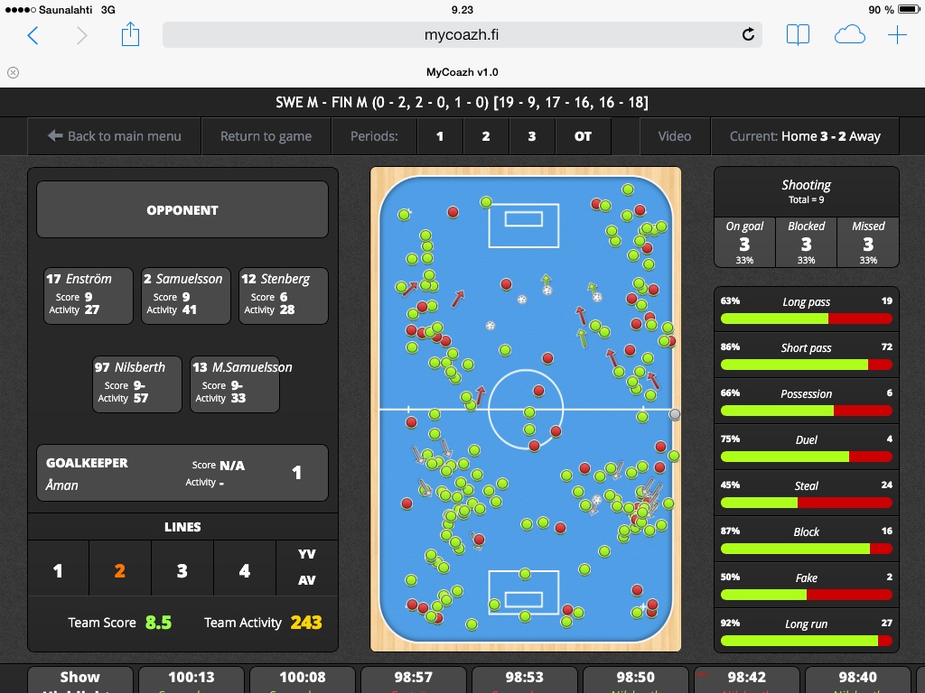 So how can you use this kind of statistical information? There are three main purposes for statistical game analysis data. Firstly you can scout the opponent and evaluate your own line-ups with it. Secondly, after doing about 10 game analyses of your team, you can get player profiles of your players. How that one player is usually performing. In one game a player can perform either better or worse than normally but an indivudual range of player’s performance can be found (Score and Activity). The most useful way to use MyCoazh is during the games. After the first period you can show the most important statistical information to coaches and they can make decisions based on them. MyCoazh gives an estimation of how the game will end if it continues the way it has started. My Coazh give support to coaches in making decisions during the game. Thirdly, you can give individual feedback to players with MyCoazh. If you link Youtube video to My Coazh game analysis with MyCoazh Video, you get all the clips/actions of one player. What a way to give individual feedback! Improve your player performance! Improve your team performance!