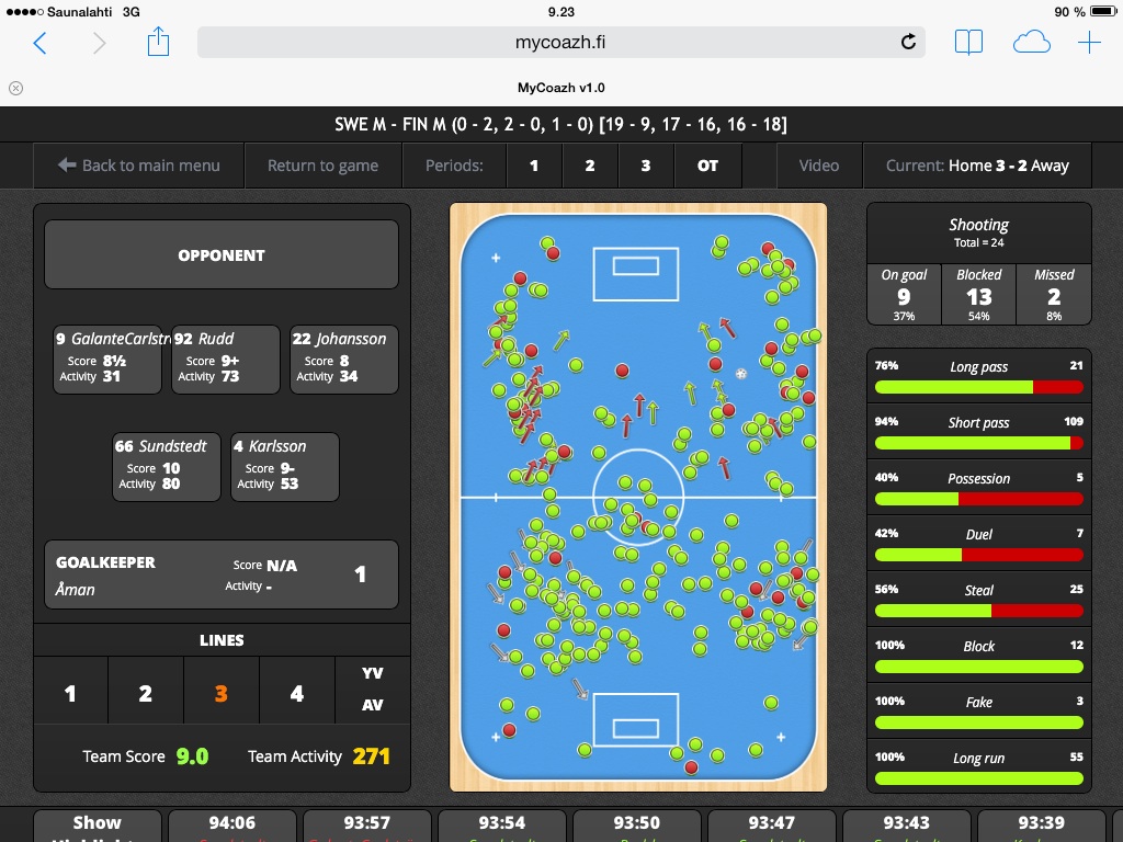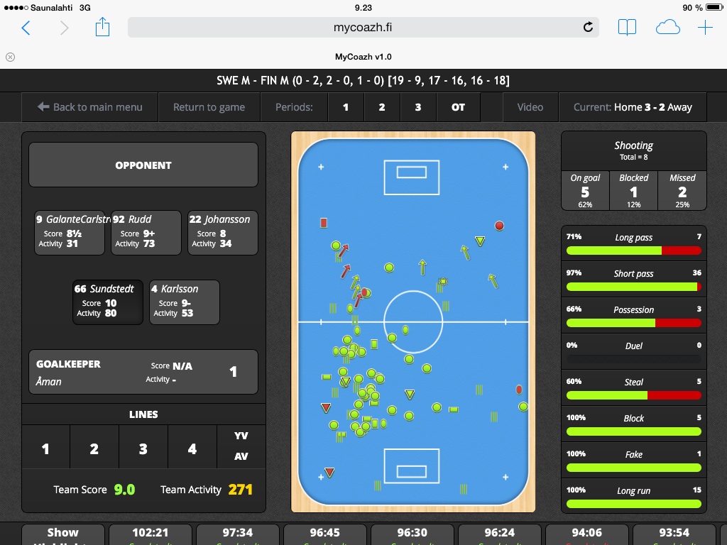 Picture 1: MyCoazh –statistics of team Sweden (Sweden attacking upwards): In MyCoazh PRO/Video every action of one team that “forwards the game” is marked. So every time player and the ball have a contact it is either successful or unsuccessful action. The Results-picture shows all the actions of the team in the game. Green dots are successful actions and red ones unsuccessful, green arrows are shots on goal and red ones either blocked or missed shots). The most interesting information on the Results-page is on the right side of the page. There are both number of actions and success percent of them. Finns were really defending their goal as the number of blocked shots (25) tells. Goalie Kosonen was one of the best in team Finland. Sweden´s Team Score 8,5 is very high. If your team average is 8,5 your team always wins the game. Team usually has 600 actions in one game. Sweden had 766 so they really possessed the ball.